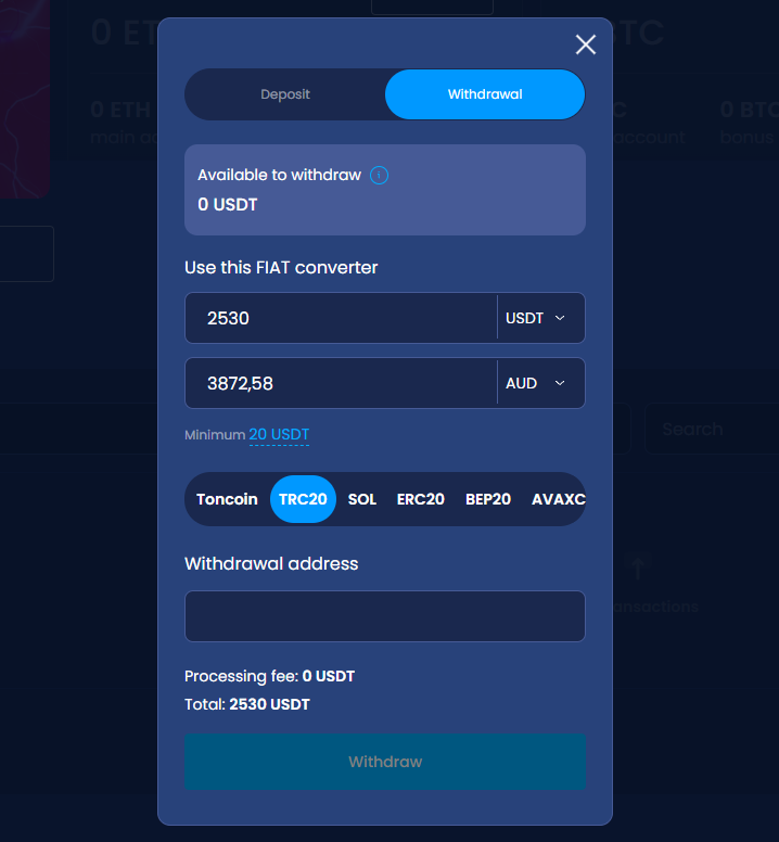 | Method | Minimum Deposit | Minimum Withdrawal | Processing Time |
