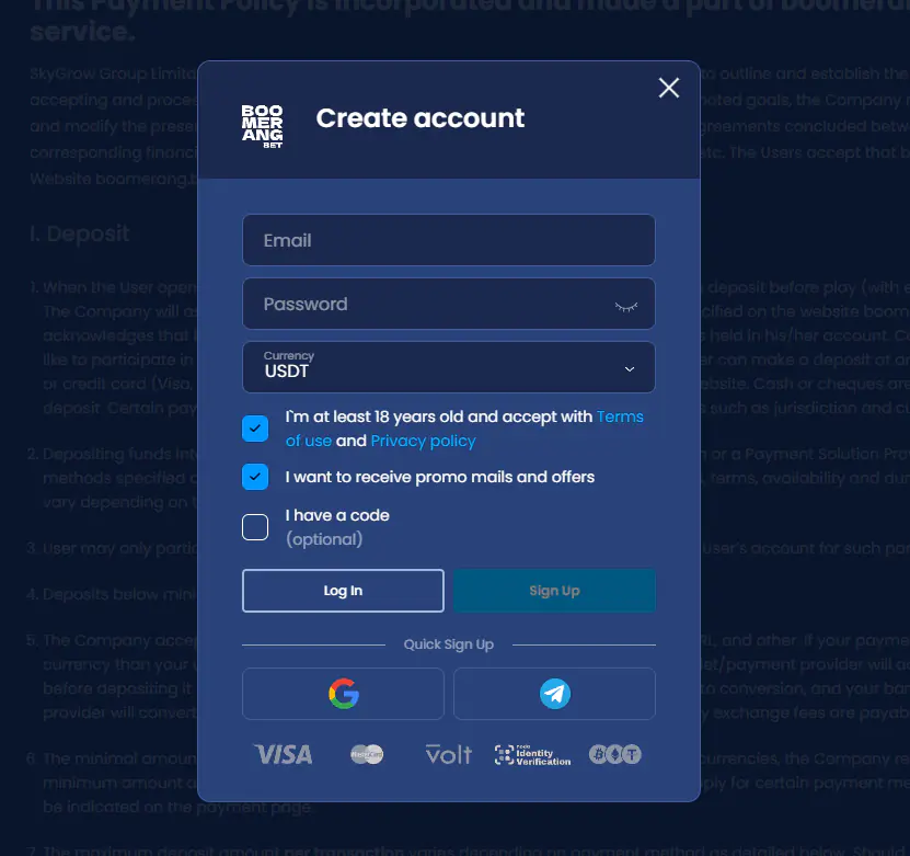 Registration at Boomerang Bet Casino
